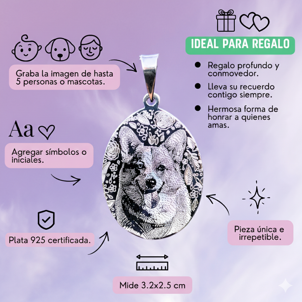 Esta medalla es Ideal para regalo, este colgante es perfecto para honrar la memoria de un ser querido o una mascota, por su tamaño puedes grabar varios rostros, mide 3.2x2.5 cm.